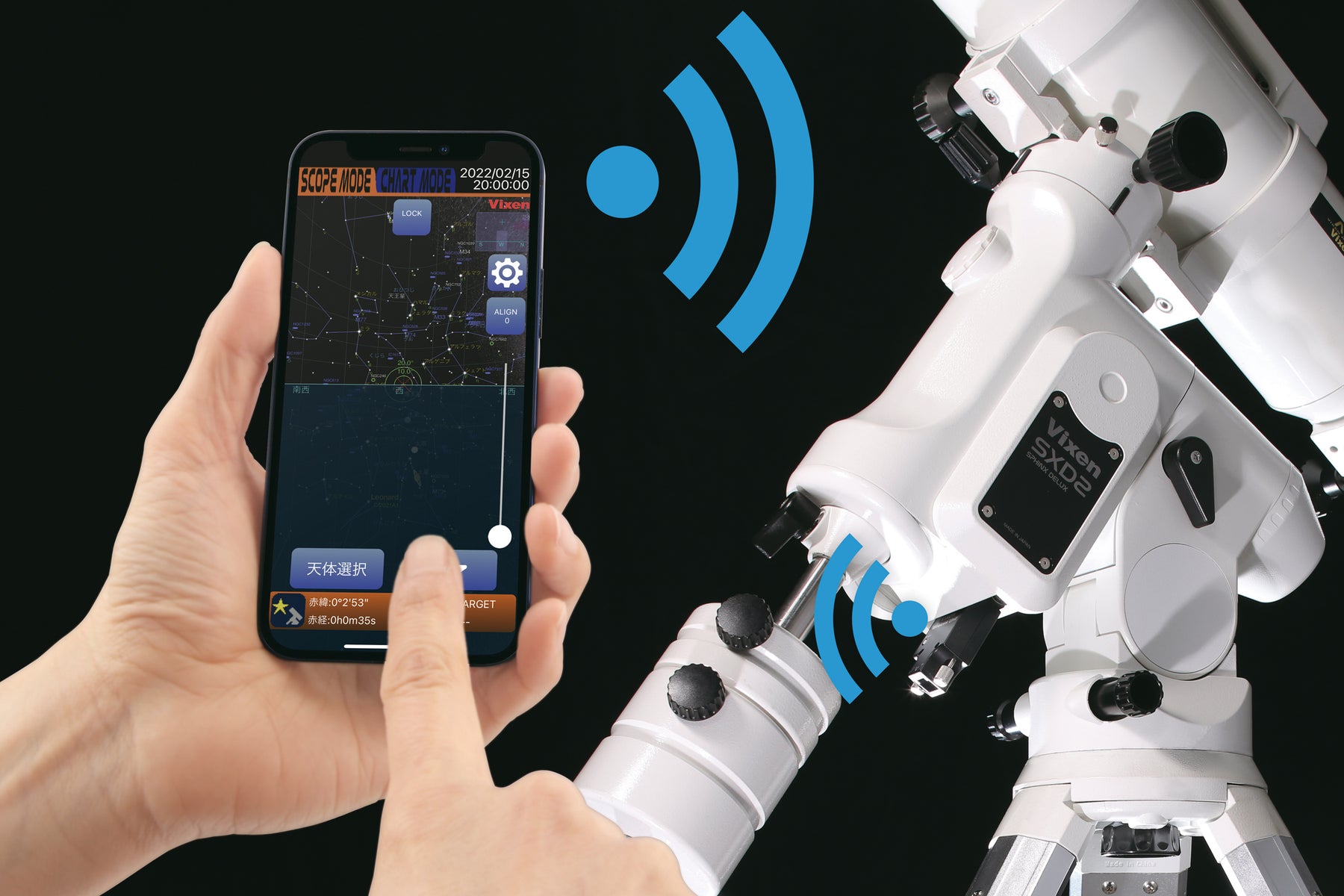 Der Vixen WLAN-Adapter für EQ-Montierungen ermöglicht die Steuerung Ihrer Vixen-Montierung per Smartphone oder Tablet. Mit der kostenlosen Smartphone-App STAR BOOK Wireless wird die Navigation am Himmel einfach und kabellos. Die App verwandelt Ihr Mobilgerät im Handumdrehen in eine Steuerung für die äquatoriale Montierung. Die Reaktionsverzögerung der Montierung, ein wesentlicher Nachteil anderer drahtloser Verbindungen, wurde auf ein Niveau reduziert, das mit einer kabelgebundenen Version vergleichbar ist.