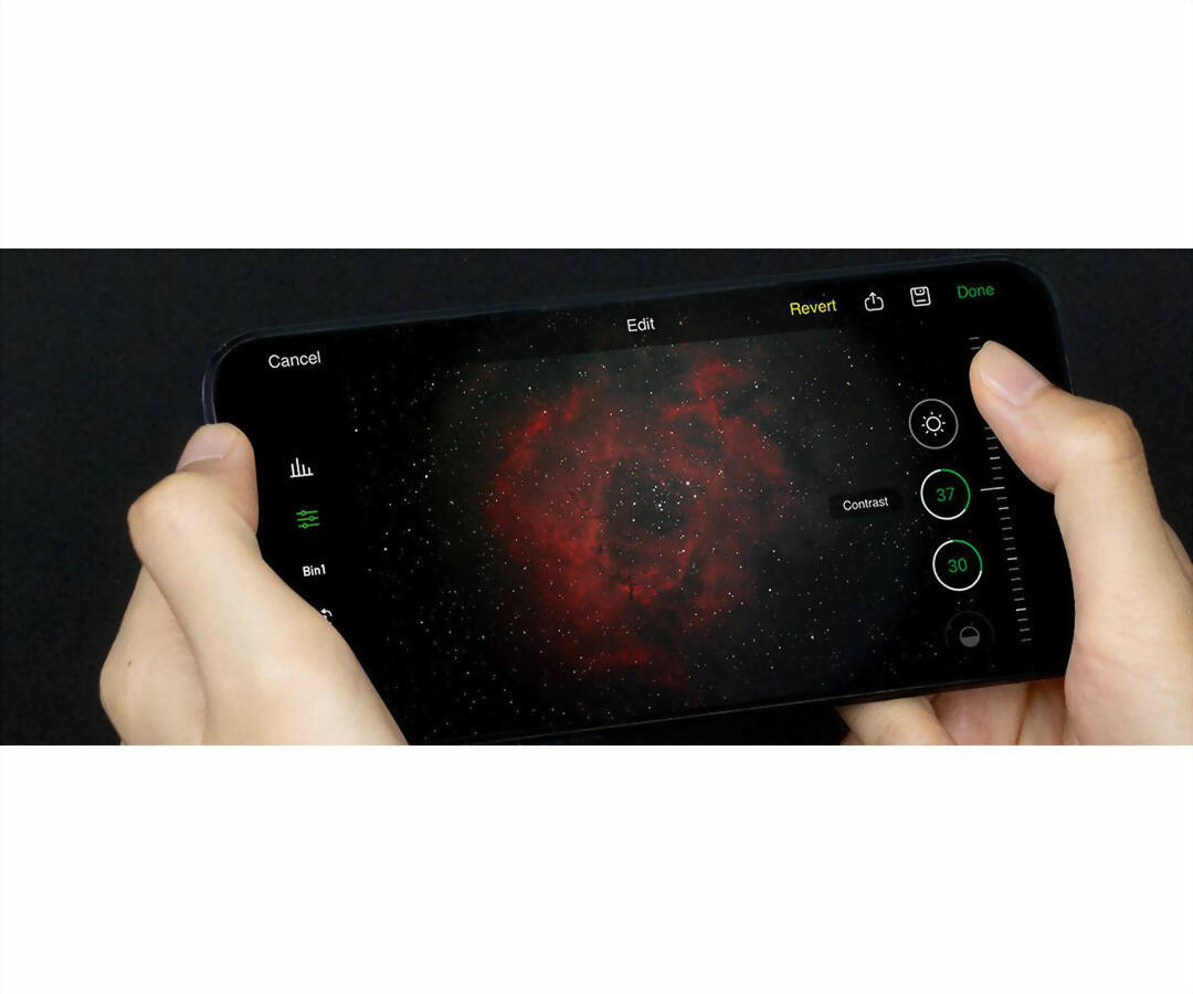 Live-Stacking wird während Ihrer Aufnahmesitzung unterstützt. Sie können außerdem Helligkeit, Kontrast und andere Parameter des fertigen Bildes anpassen, sodass Sie Ihre gestapelten Fotos sofort in sozialen Medien oder mit Freunden und Familie teilen können.